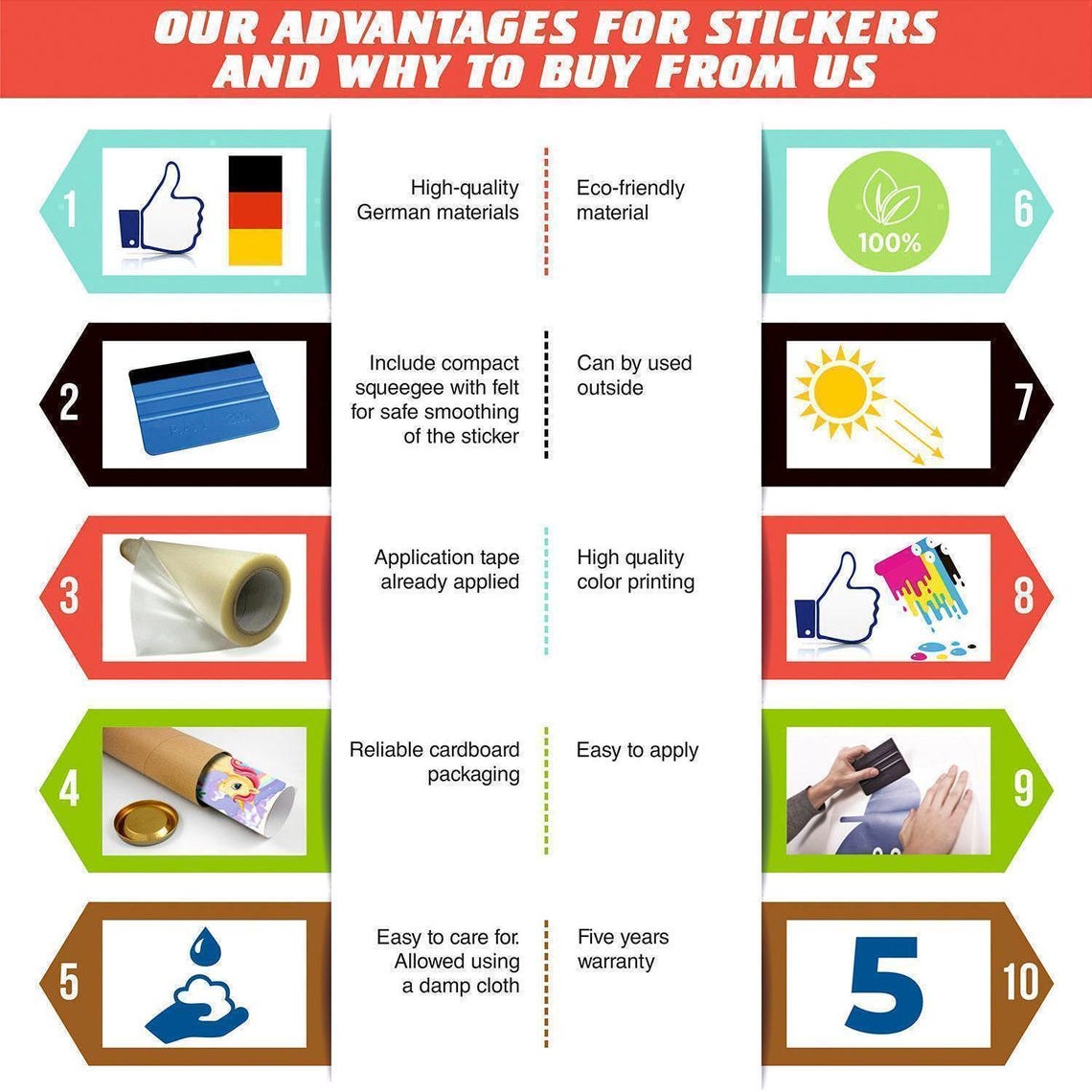 MADE FROM QUALITY MATERIAL: These stickers are printed from eco-friendly ink of the SunChemical brand on the eco-friendly and high-quality matte film of the German brand Orafol with a 5-year warranty. No lines, waves, folds, or bubbles after you put the sticker on. The sticker is waterproof and will not fade in the sun. The colors are bright and rich.