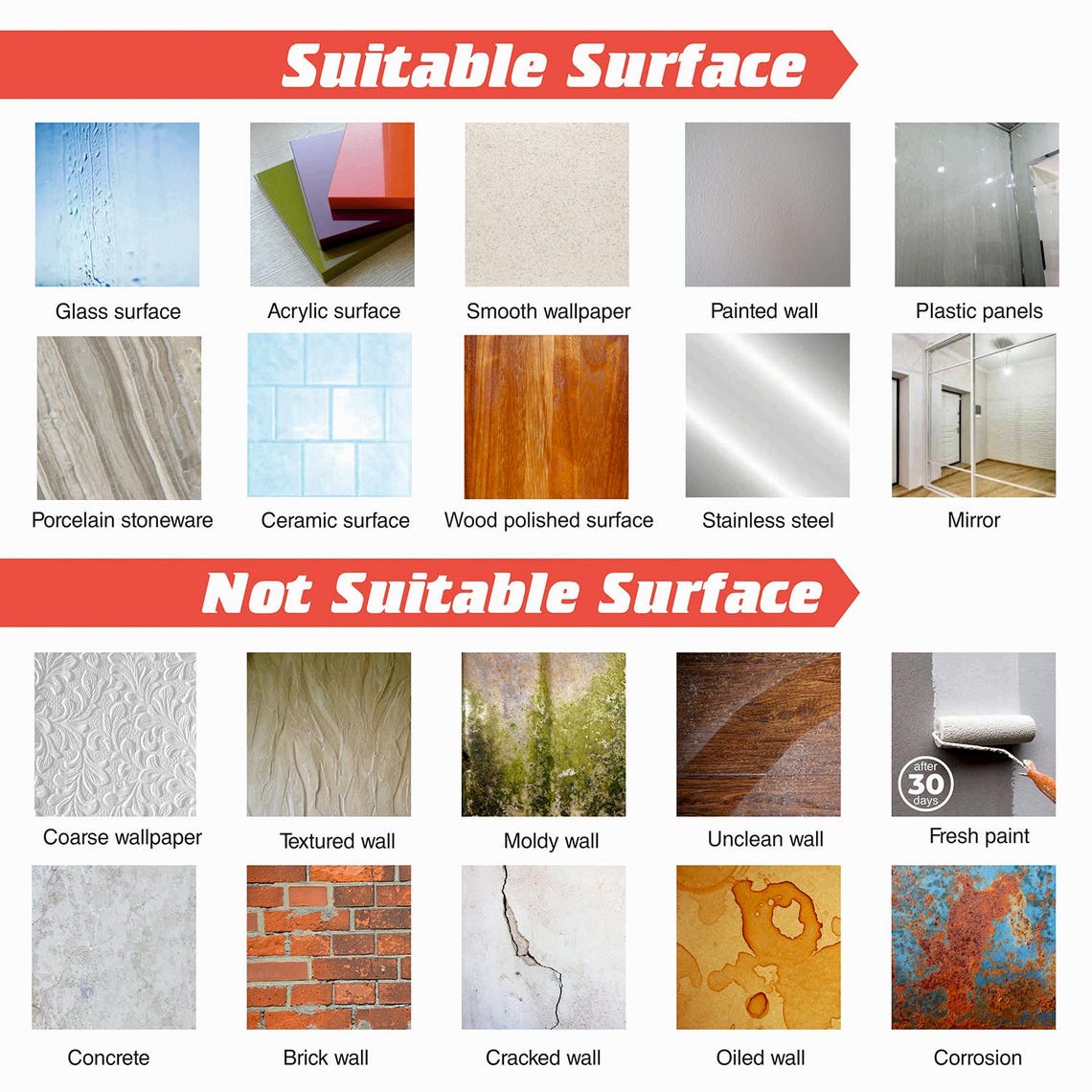 COMPATIBILITY: It is compatible for indoor and outdoor on any flat, dry, and only smooth surface like a painted wall, a wall with smooth wallpaper, ceramic cladding, windows, plastic, mirror, smooth wood, metal, and others. We recommend you wait at least three weeks before applying the decal to newly painted walls. You shouldn’t apply it near a heat source (e.g. radiator or fireplace)