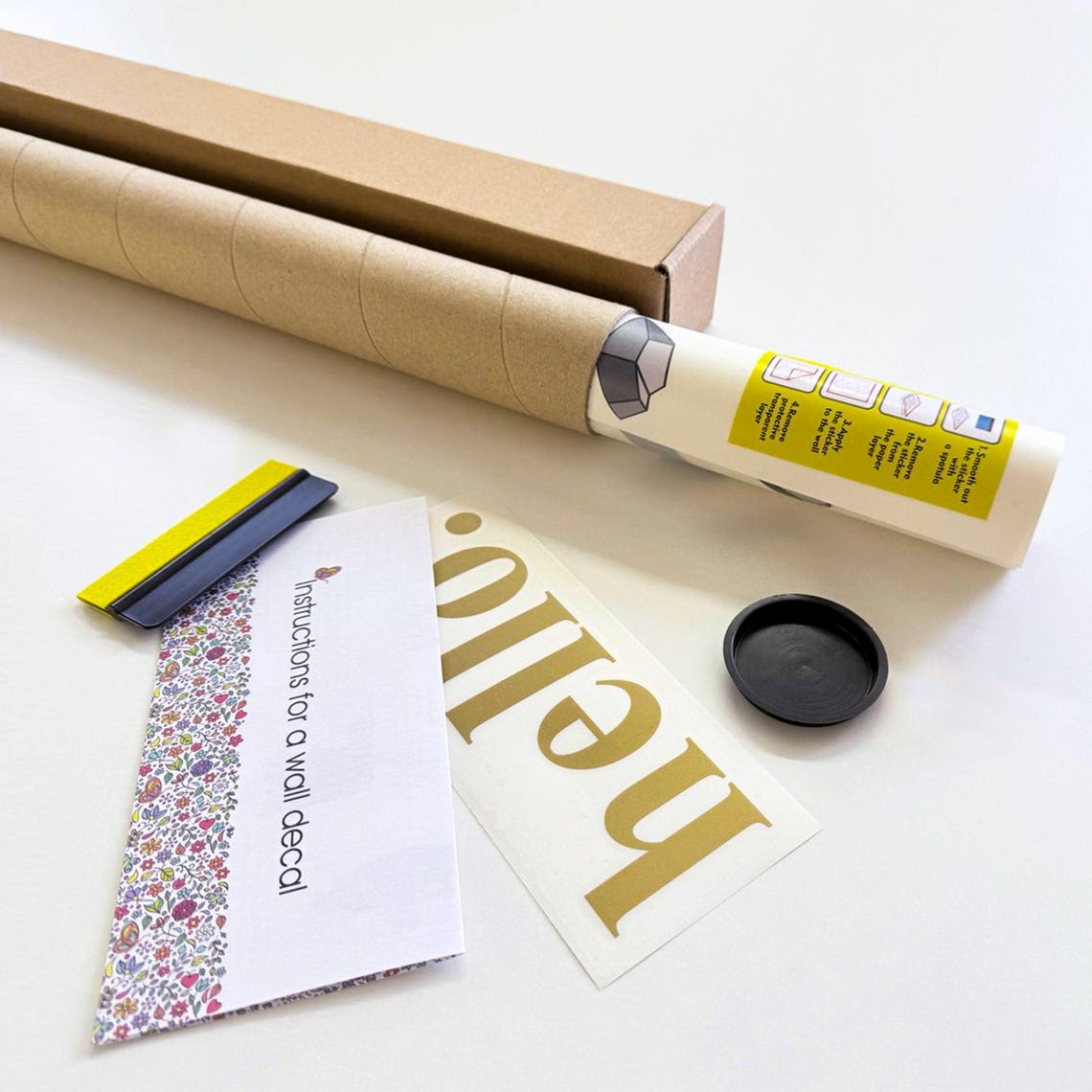 QUICK INSTALLATION INSTRUCTIONS: Peel off the bottom of the decal and apply to the wall, then smooth it out with the spatula provided, then remove the top of the application tape.