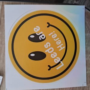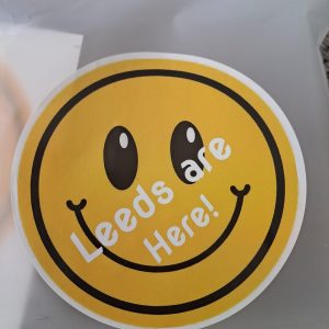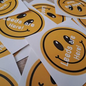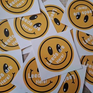 This is for 10 extra large smiley face Leeds stickers printed “LEEDS ARE HERE!”