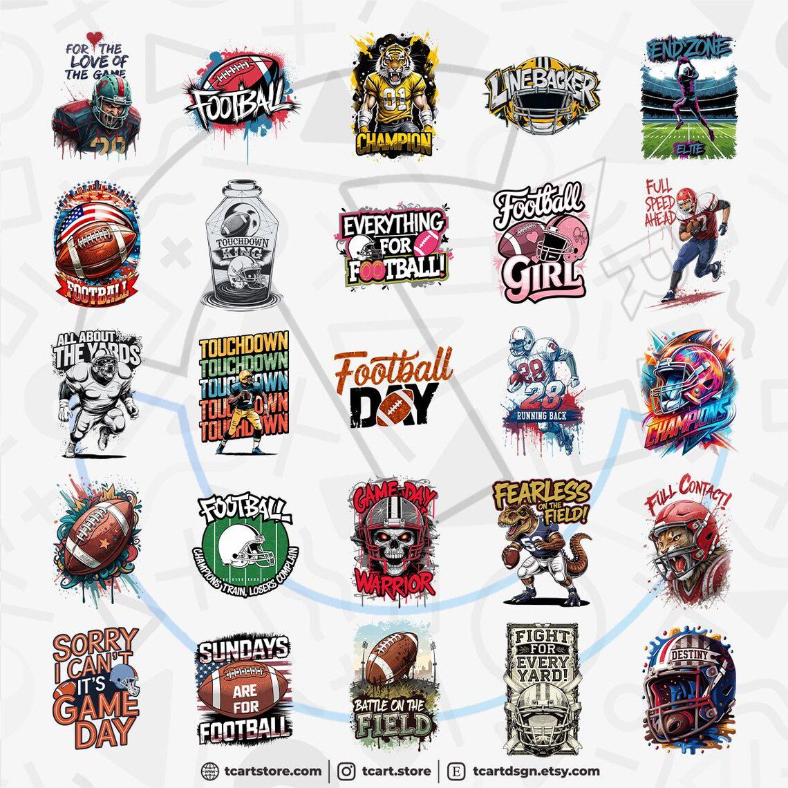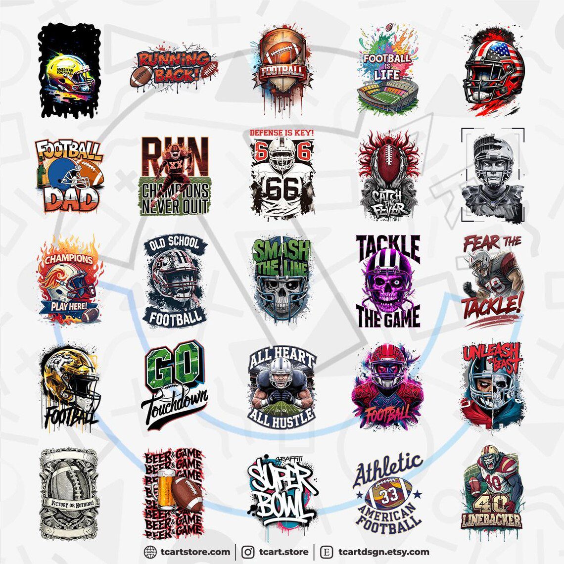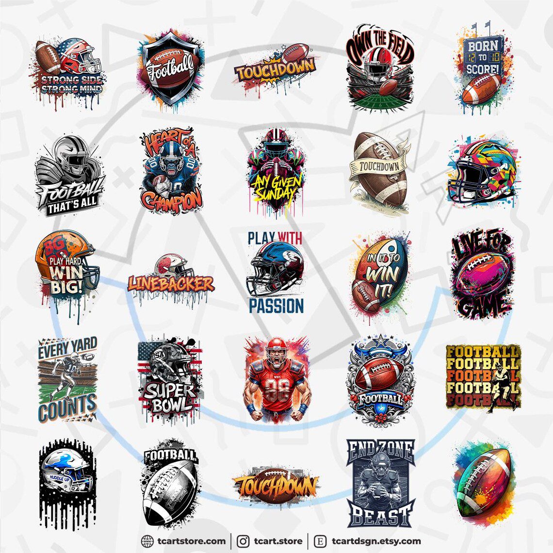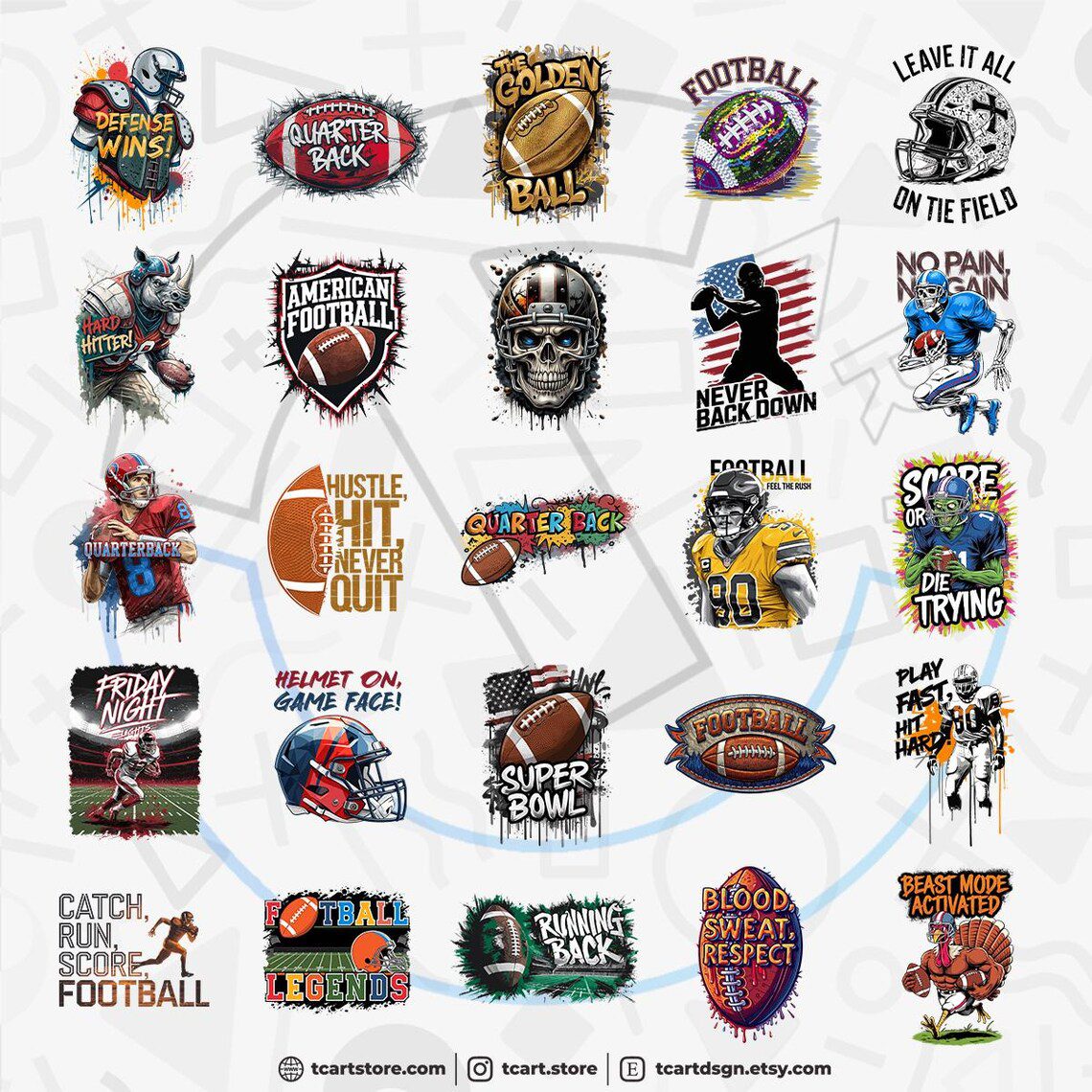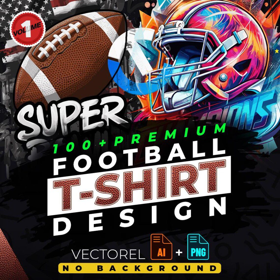 The pdf you purchased contains 100 premium football 1 vector designs suitable for printing.