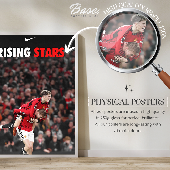 Iconic Imagery: Featuring high-resolution images of Garnacho and Hojlund, this poster encapsulates their incredible talents and vibrant charisma, making it a remarkable conversation starter.
