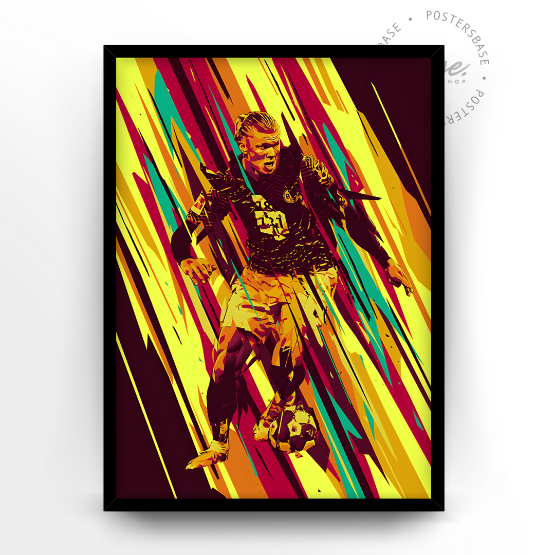 Iconic Representation: This poster features a visually striking portrayal of Haaland, capturing his incredible skills and dynamic energy on the field, perfect for any football lover.