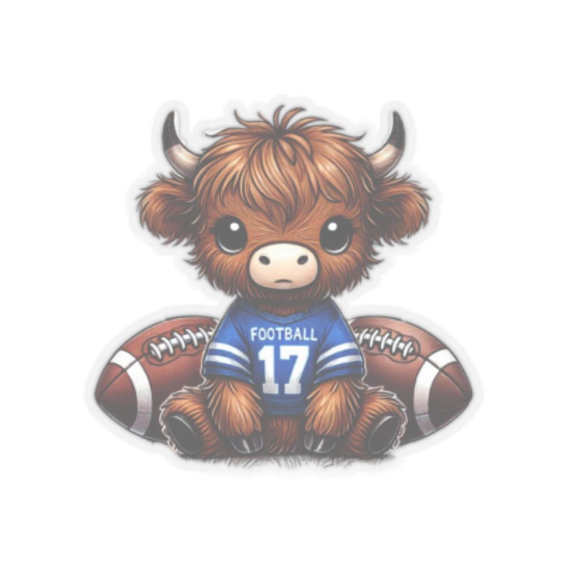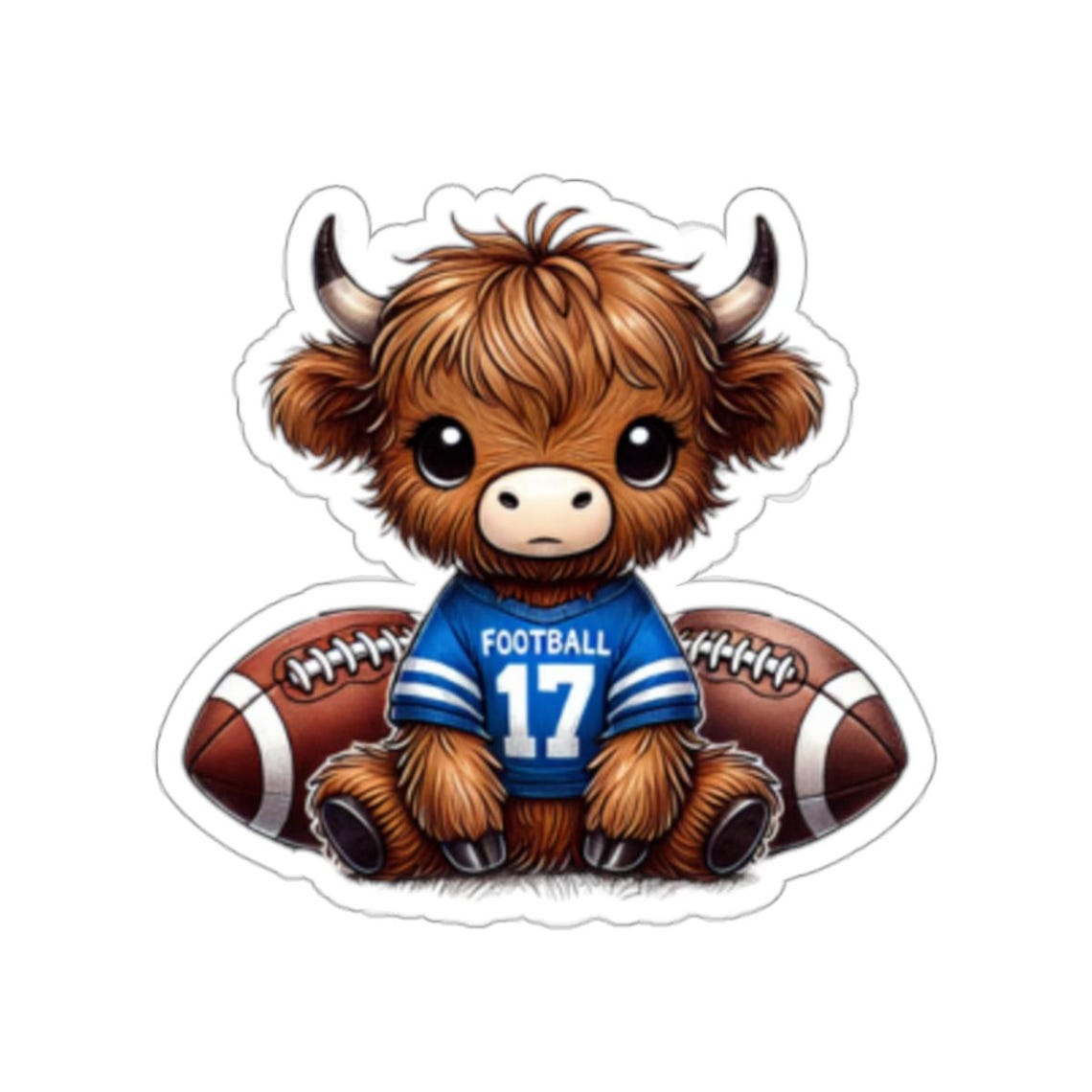 A fun and quirky collection of kiss-cut stickers featuring a highland cow wearing a blue football jersey. These stickers are perfect for those looking to add a playful touch to their laptops, journals, or windows. Ideal for animal lovers, sports fans, and those who enjoy unique designs. Great for decorating during sports seasons or game days.