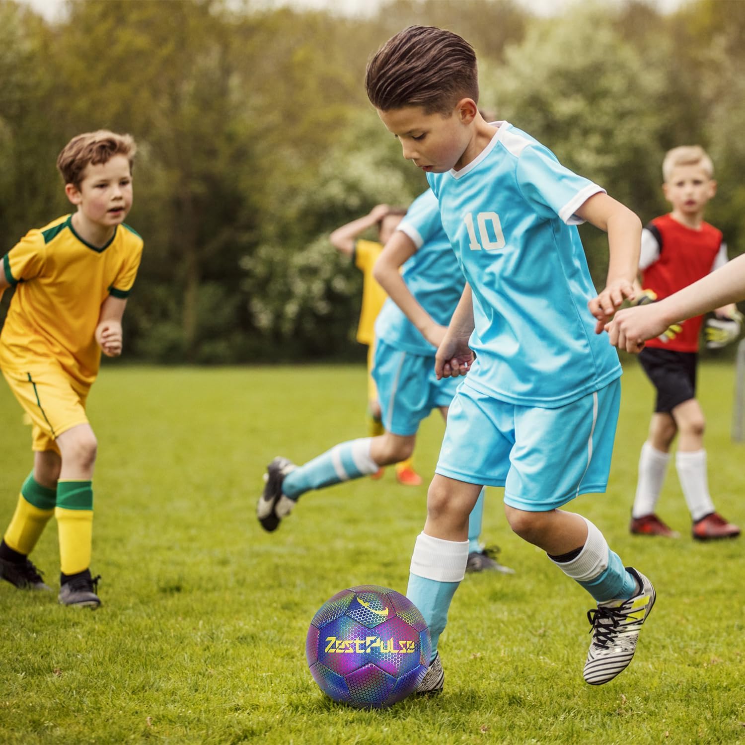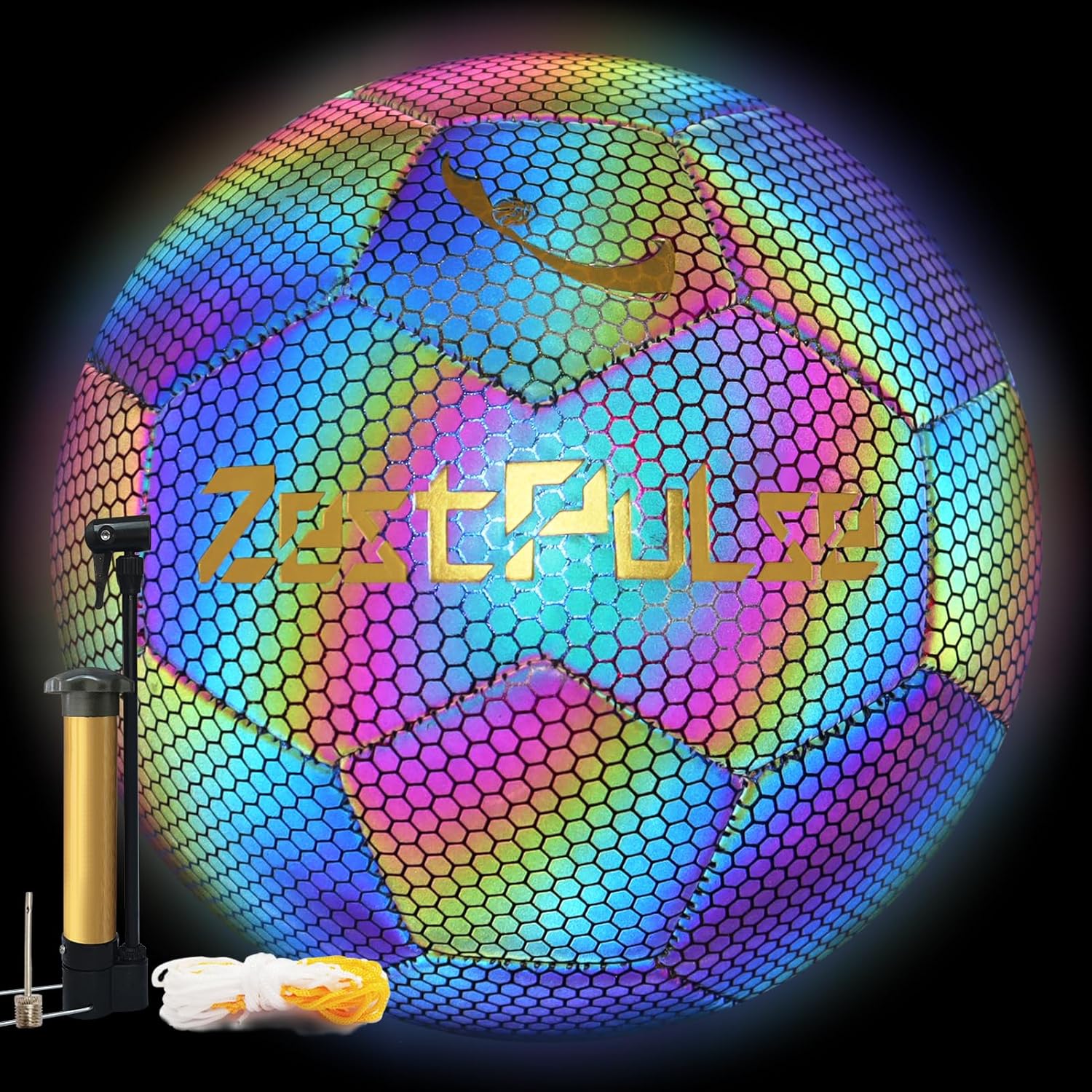 UNIQUE HOLOGRAPHIC APPEARANCE- Stand out on the field with ZestPulse’s soccer ball, featuring a shiny, holographic reflective surface that captivates kids and adults alike. It’s not just a ball—it’s an opportunity to play in style and make a statement.