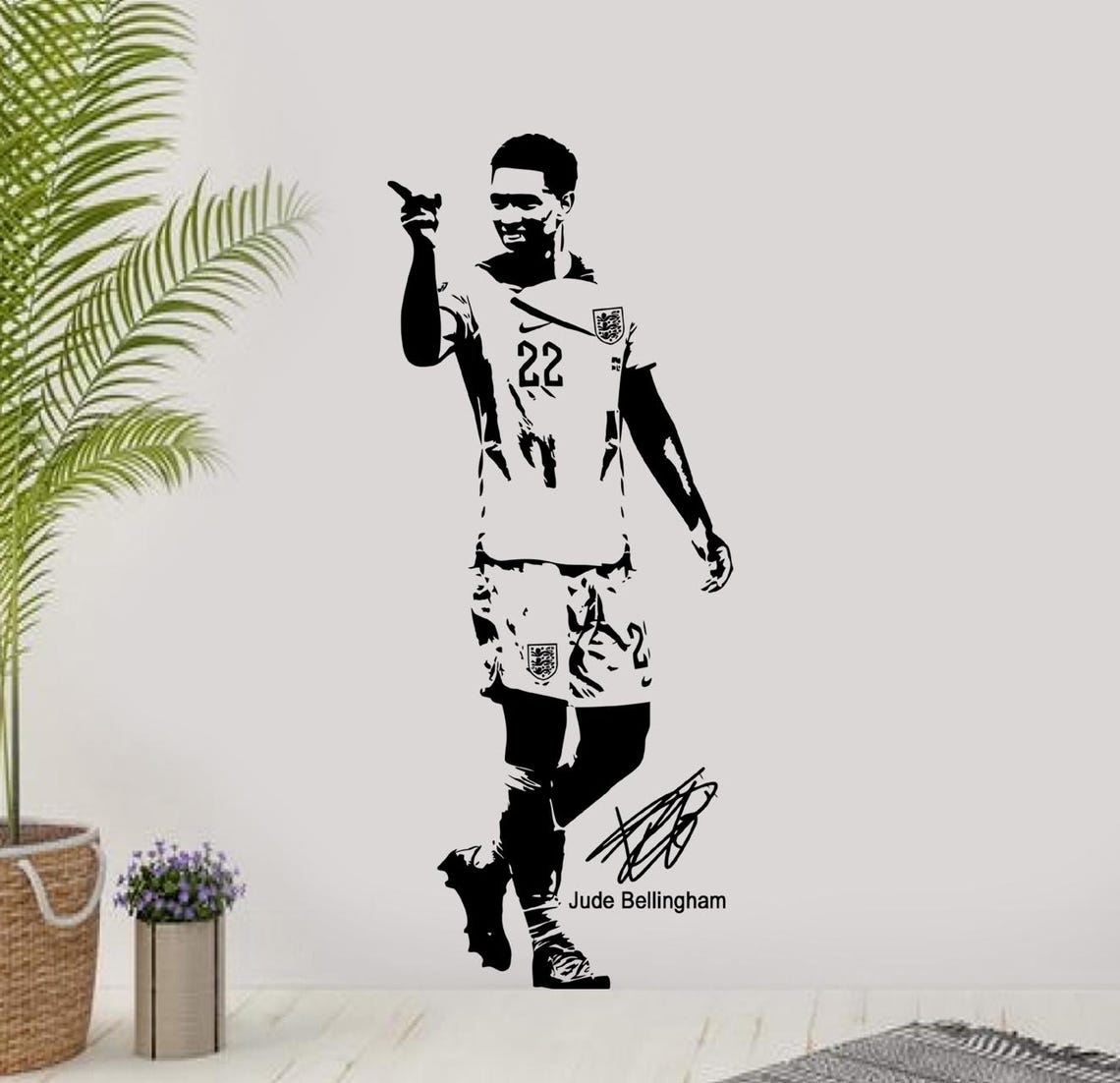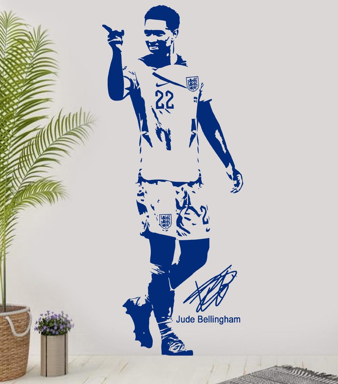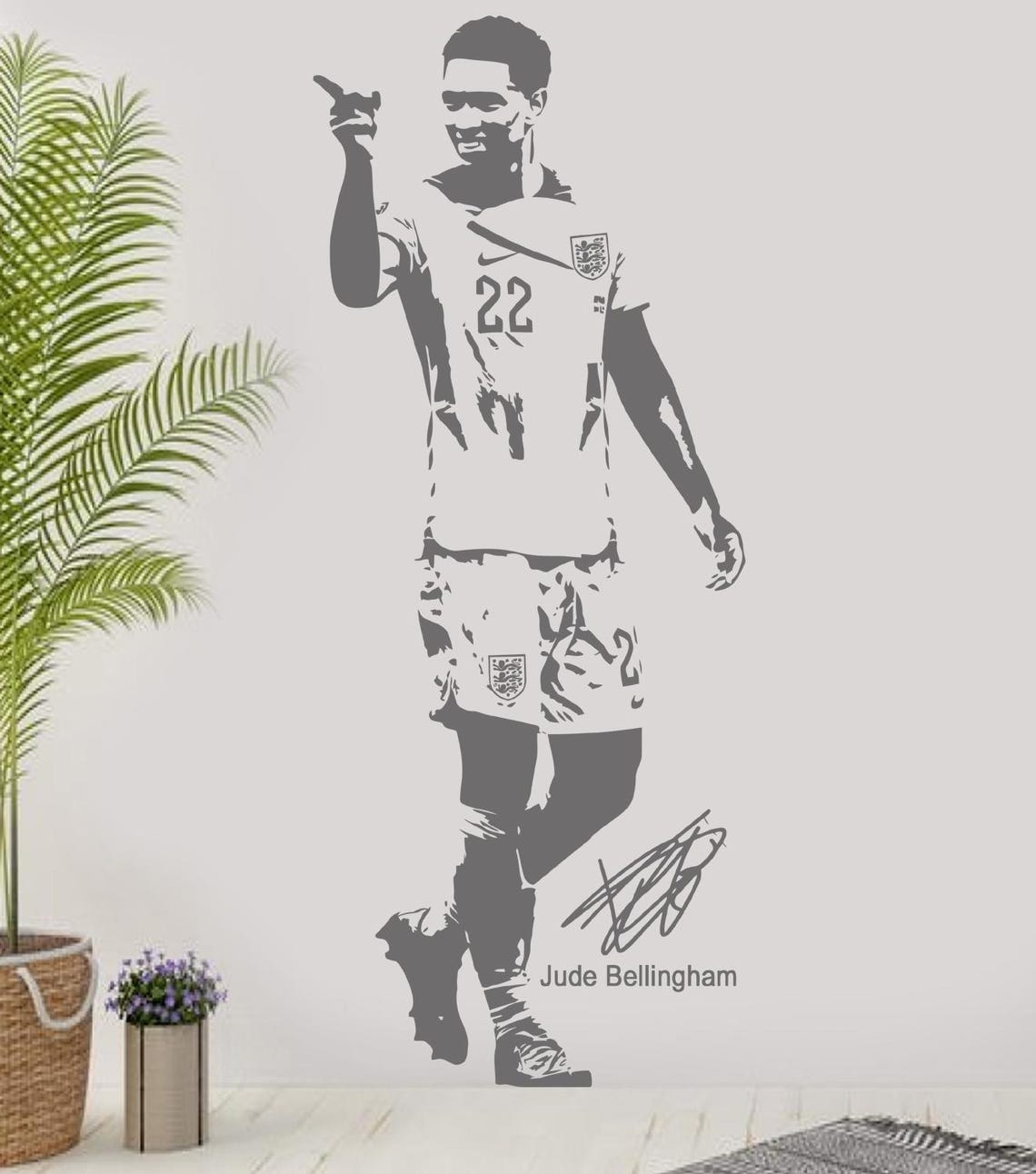 Transform your space with this high-quality Judde Belllingham England football wall sticker. Perfect for any football fan, this vinyl decal is ideal for bedrooms, living rooms, or game rooms. Show your support for one of England’s top football talents with this stylish and durable wall art.