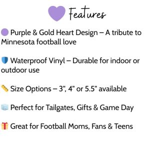 Show your Minnesota football love loud and proud with this bold vinyl sticker! Featuring a heart-shaped design in iconic purple and gold, this waterproof decal is perfect for fans who bleed team spirit.