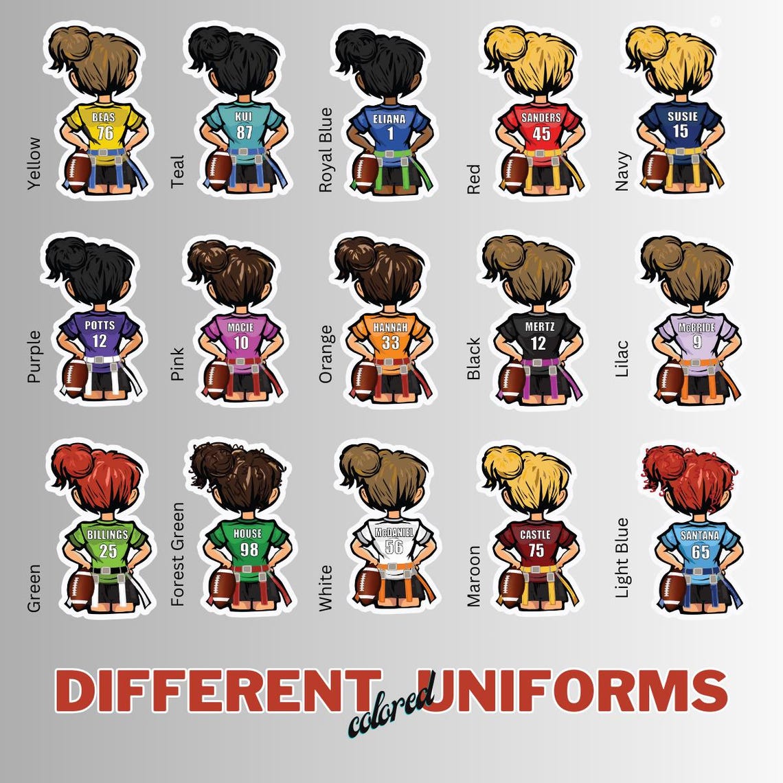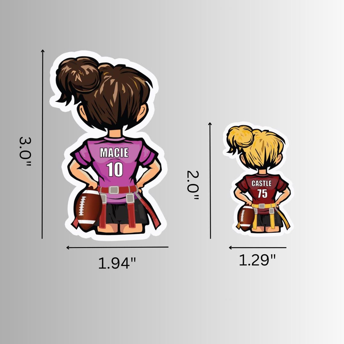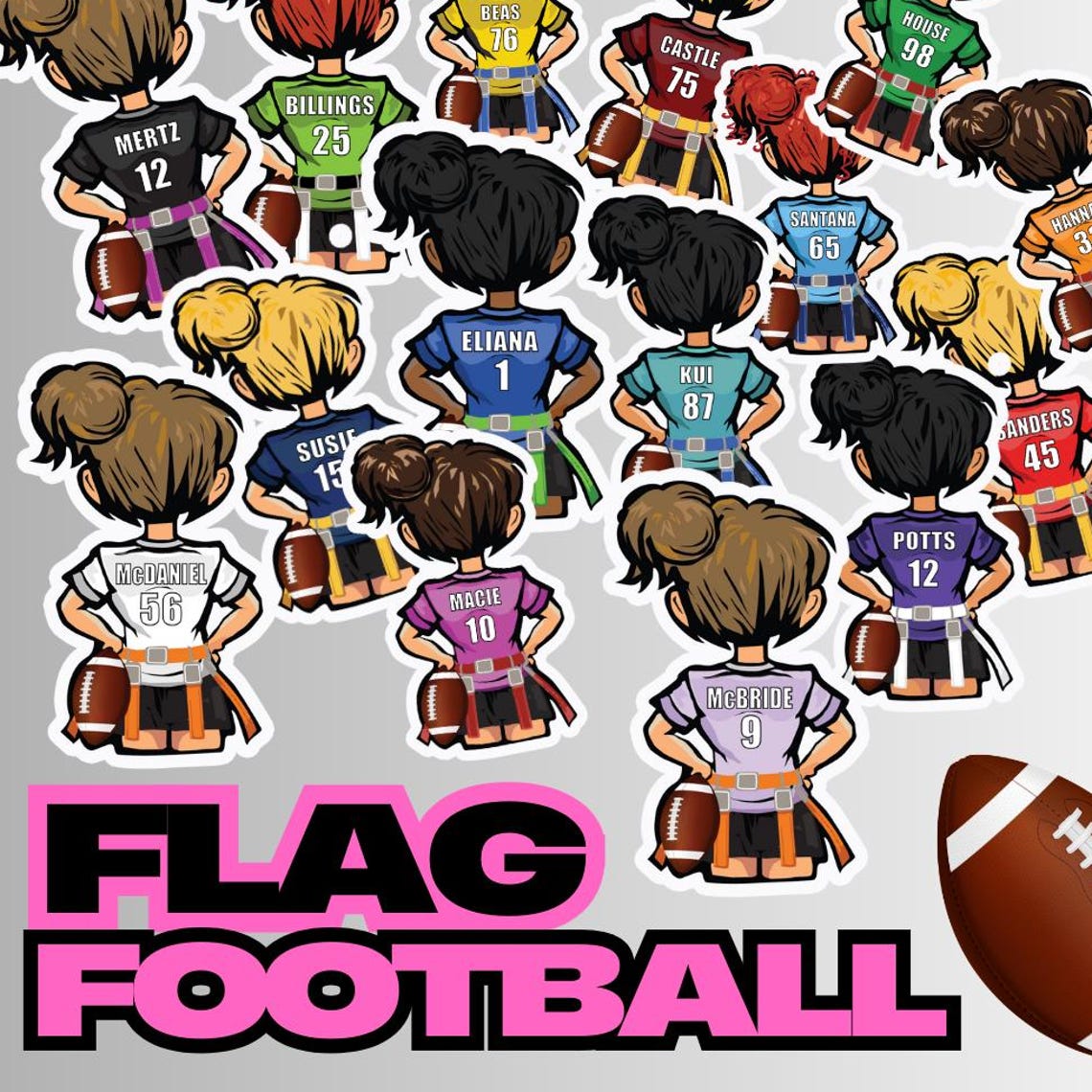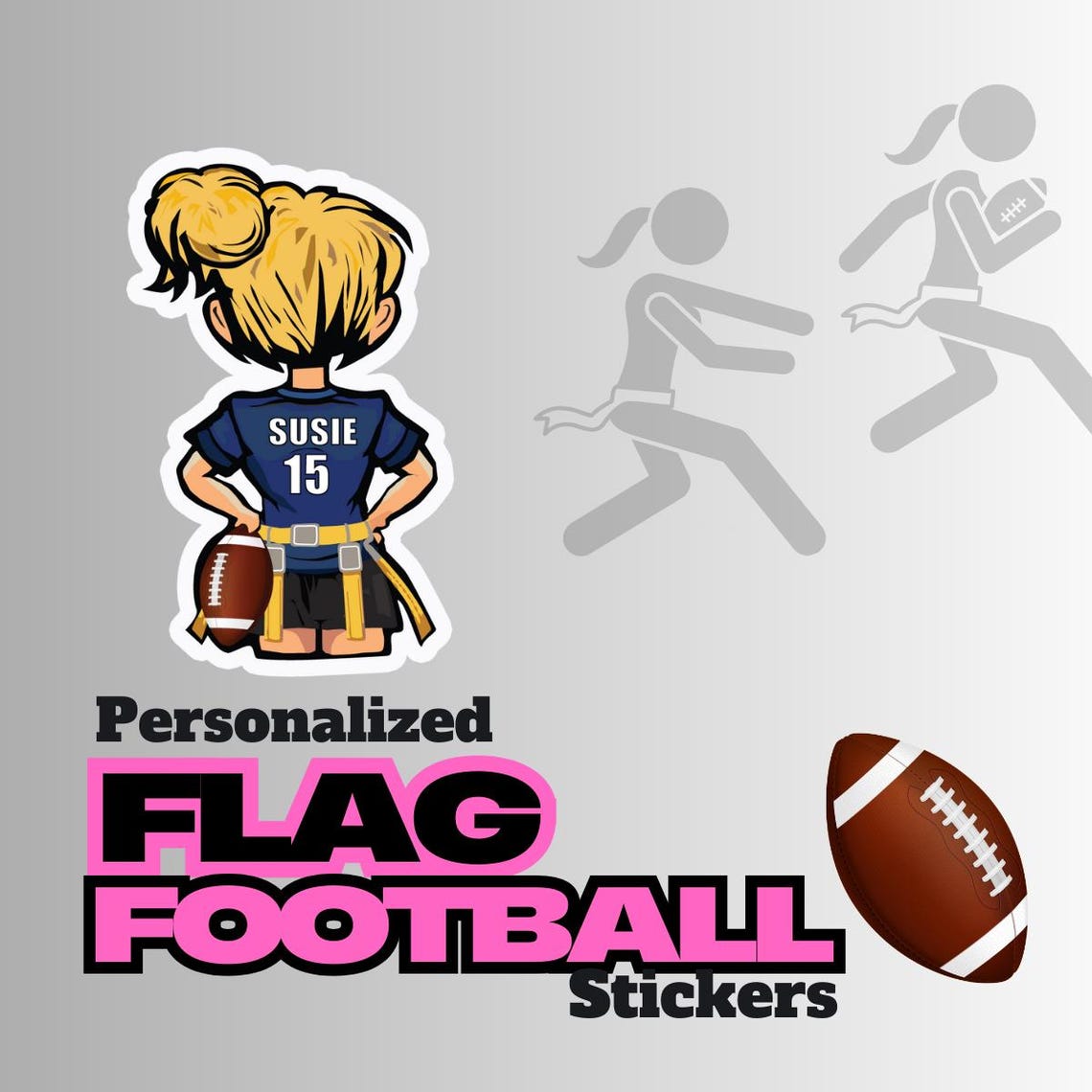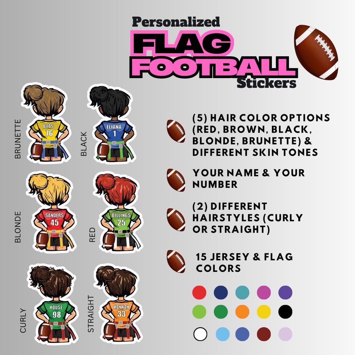 Personalized Girls Flag Football, Powderpuff Football Stickers with your name, number, different hair color options & 15 Jersey Colors. Peel and stick these durable vinyl labels on your water bottle, laptop, cell phone, or mug. Personalized gift.