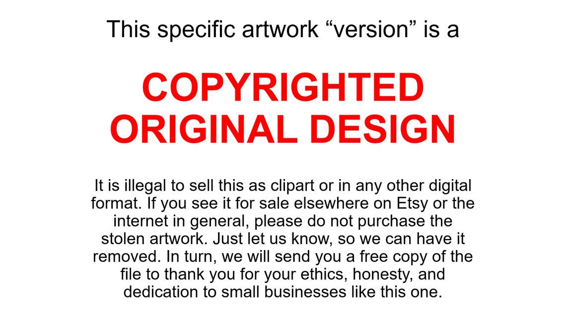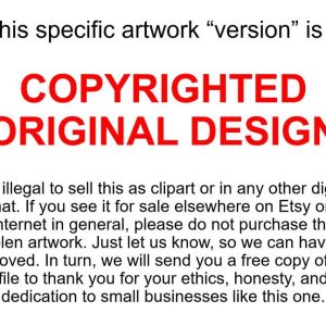You can make physical items with this design on them for personal or commercial use. You may NOT use this as CLIPART or any other DIGITAL format to sell, this includes uploading the clipart to “print on demand” sites (that is not allowed because YOU are not making the product, you are getting paid for them to use the clipart