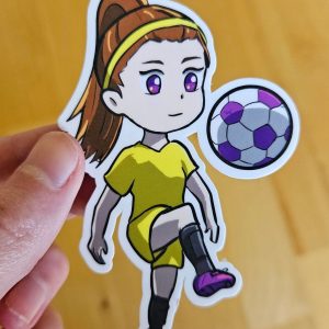 Glossy waterproof vinyl stickers of womens girls soccer football player. Cute, chibi handmade and hand drawn original designs. Kawaii style